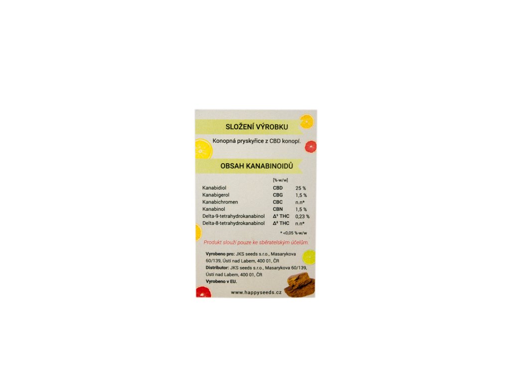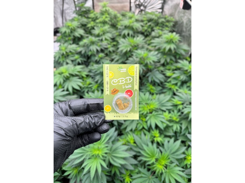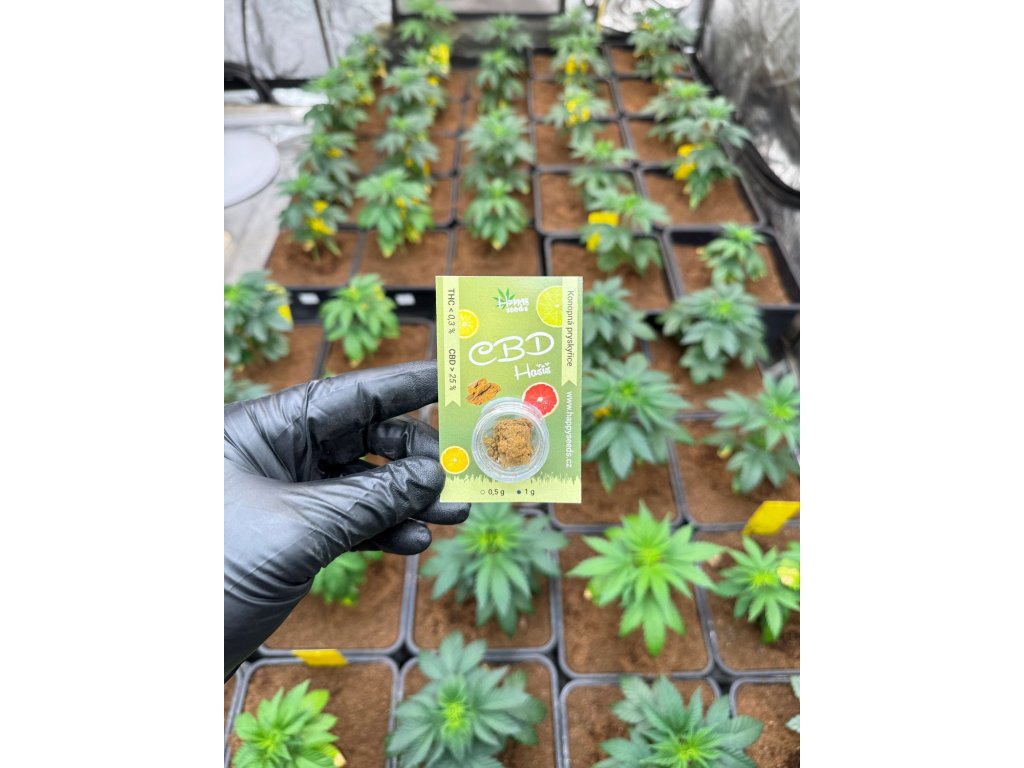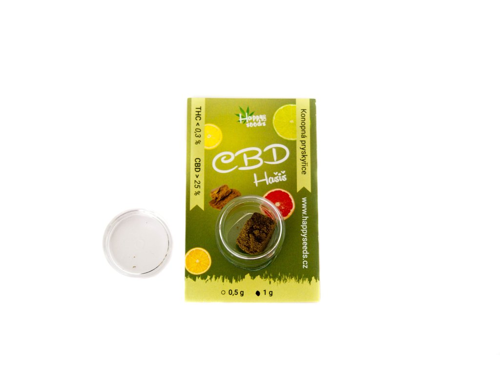 CBD hašiš s ovocně-citrusovou vůní od Happy seeds v balení po 0,5 nebo 1 gramu. Obsah CBD je 25 % zatímco THC se drží pod hranicí 0,3%.