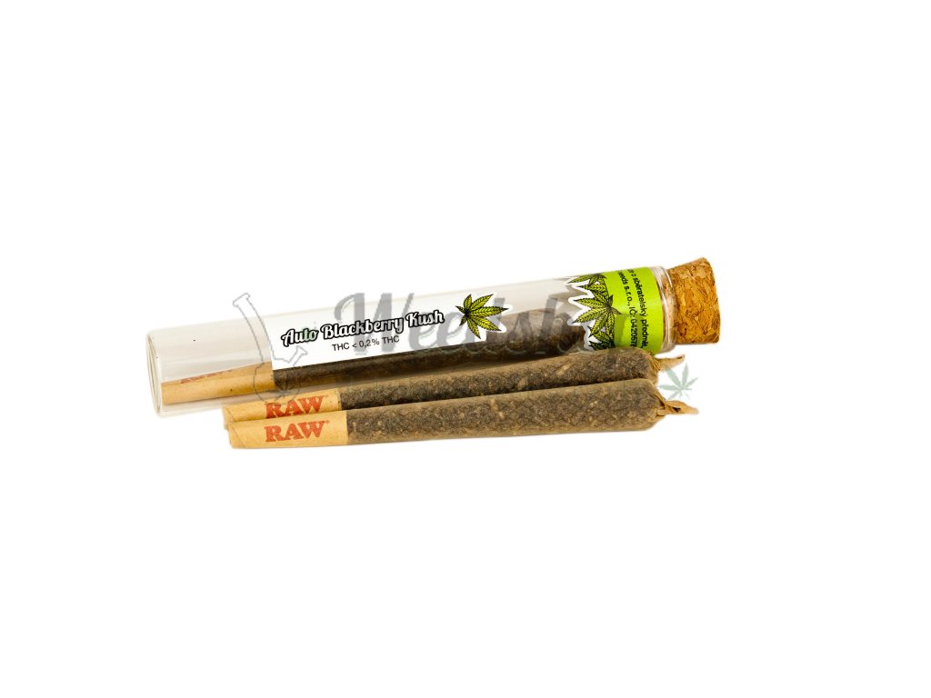 Kvalitní a čerstvé české CBD konopí, hnojené pouze organickými hnojivy, odrůdy Auto Blackberry Kush s obsahem CBD až 9 % a zároveň s obsahem THC do 0,2% balené v papírku oblíbené značky kuřáckých potřeb RAW v nejpoužívanější velikosti King Size - 110 mm, který zaručuje pomalé a rovnoměrné hoření spolu s papírovým RAW filtrem, a to vše uchované ve skleněné nádobě - joint tubě, uzavřené korkovým uzávěrem, která je vhodná k opakovanému použití a zabraňuje snížení kvality našeho produktu. Obsah každého CBD jointu je cca 0,9 - 1,1 gramu konopí odrůdy Auto Blackberry Kush.